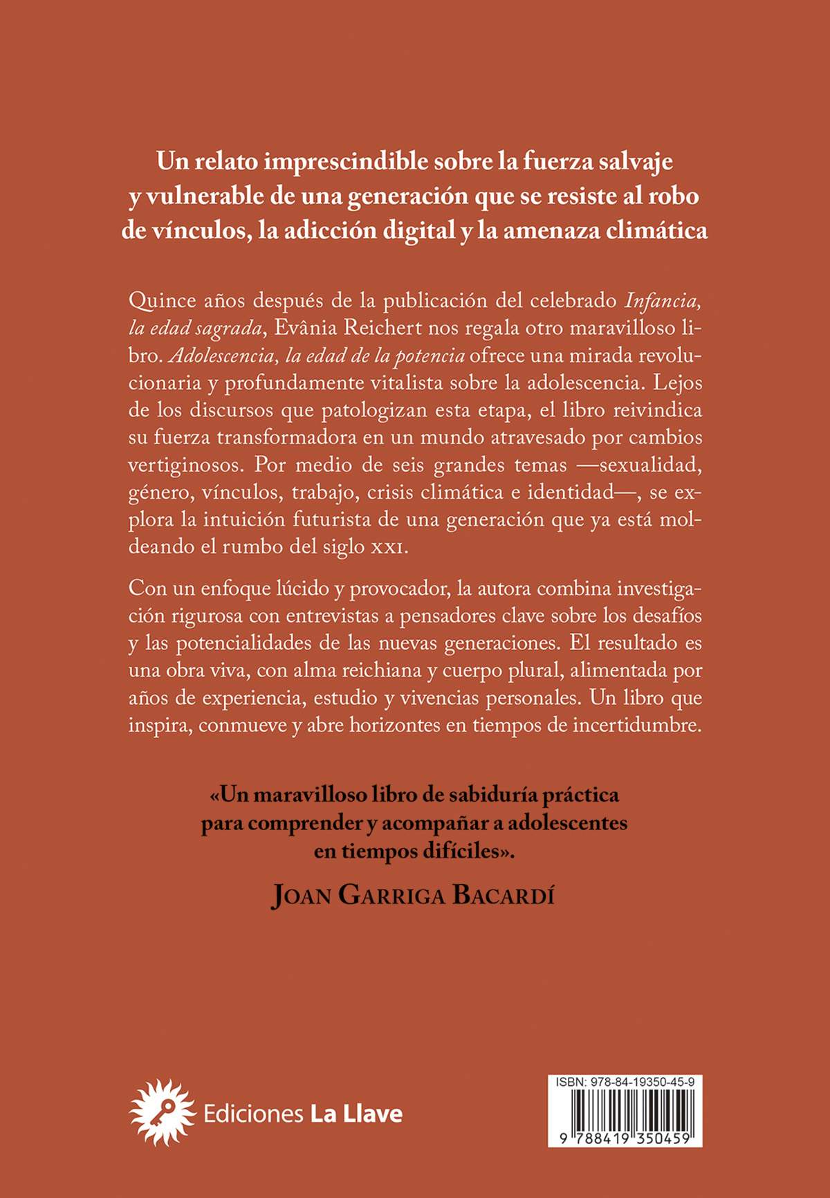 Quince años después de la publicación del celebrado Infancia, la edad sagrada, Evânia Reichert nos regala otro maravilloso libro. Adolescencia, la edad de la potencia ofrece una mirada revolucionaria y profundamente vitalista sobre la adolescencia. Lejos de los discursos que patologizan esta etapa, el libro reivindica su fuerza transformadora en un mundo atravesado por cambios vertiginosos. Por medio de seis grandes temas —sexualidad, género, vínculos, trabajo, crisis climática e identidad—, se explora la intuición futurista de una generación que ya está moldeando el rumbo del siglo XXI.
