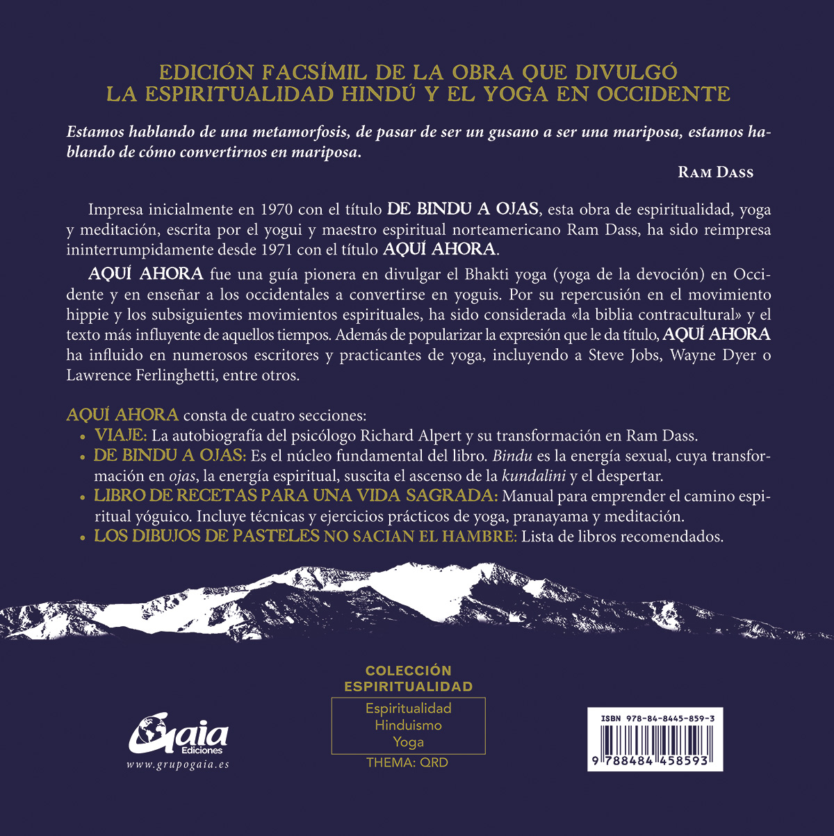 Impresa inicialmente en 1970 con el título DE BINDU A OJAS, esta obra de espiritualidad, yoga y meditación, escrita por el yogui y maestro espiritual norteamericano Ram Dass, ha sido reimpresa ininterrumpidamente desde 1971 con el título AQUÍ AHORA.