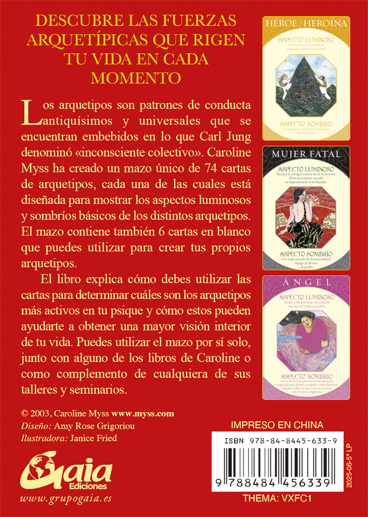Caroline Myss ha creado un mazo único de 74 cartas de arquetipos, cada una de las cuales está diseñada para mostrar los aspectos luminosos y sombríos básicos de los distintos arquetipos. El mazo contiene también 6 cartas en blanco que puedes utilizar para crear tus propios arquetipos.