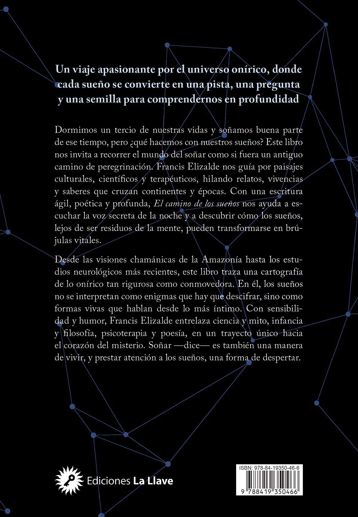 Dormimos un tercio de nuestras vidas y soñamos buena parte de ese tiempo, pero ¿qué hacemos con nuestros sueños? Este libro nos invita a recorrer el mundo del soñar como si fuera un antiguo camino de peregrinación. Francis Elizalde nos guía por paisajes culturales, científicos y terapéuticos, hilando relatos, vivencias y saberes que cruzan continentes y épocas. Con una escritura ágil, poética y profunda, El camino de los sueños nos ayuda a escuchar la voz secreta de la noche y a descubrir cómo los sueños, lejos de ser residuos de la mente, pueden transformarse en brújulas vitales.