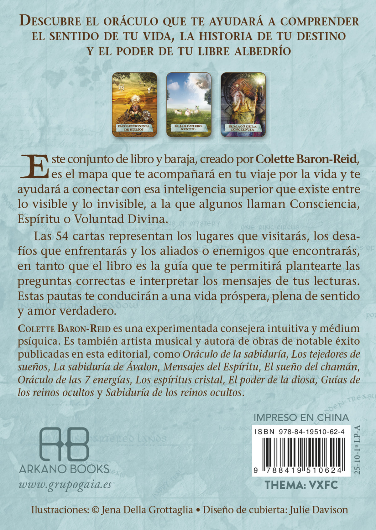 Las 54 cartas representan los lugares que visitarás, los desafíos que enfrentarás y los aliados o enemigos que encontrarás, en tanto que el libro es la guía que te permitirá plantearte las preguntas correctas e interpretar los mensajes de tus lecturas.