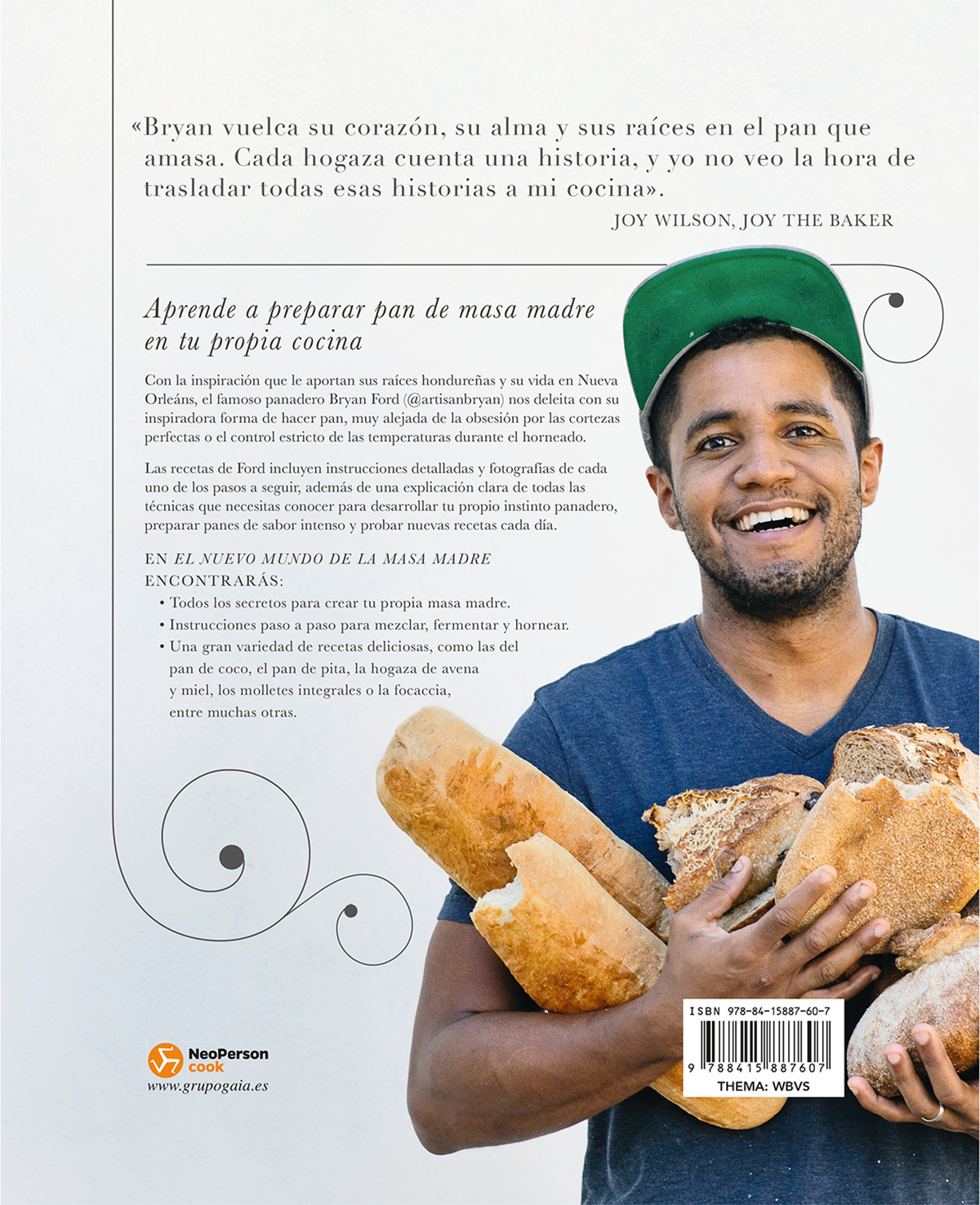 BRYAN FORD es un panadero de Nueva Orleans conocido por experimentar con nuevas técnicas de panadería, inspirado por su pasión y herencia latinoamericanas, lo que ha hecho que su blog de recetas www.artysanbryan y su cuenta de Instagram @artisanbryan se hayan vuelto muy famosos. Con visitas procedentes de más de cien países, el blog Artisan Bryan ganó en 2019 el premio al Mejor blog sobre panadería y pastelería de la revista Saveur. La fama de Ford se debe sobre todo a su receta de «Pan de coco con masa madre», inspirada en el típico pan de Honduras. En la actualidad, Bryan trabaja como asesor para panaderías de Estados Unidos y Centroamérica.