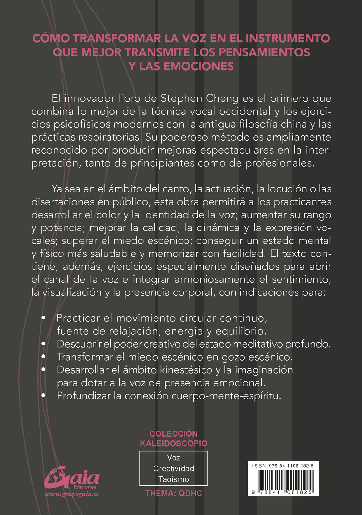 El innovador libro de Stephen Cheng es el primero que combina lo mejor de la técnica vocal occidental y los ejercicios psicofísicos modernos con la antigua filosofía china y las prácticas respiratorias. Su poderoso método es ampliamente reconocido por producir mejoras espectaculares en la interpretación, tanto de principiantes como de profesionales.
