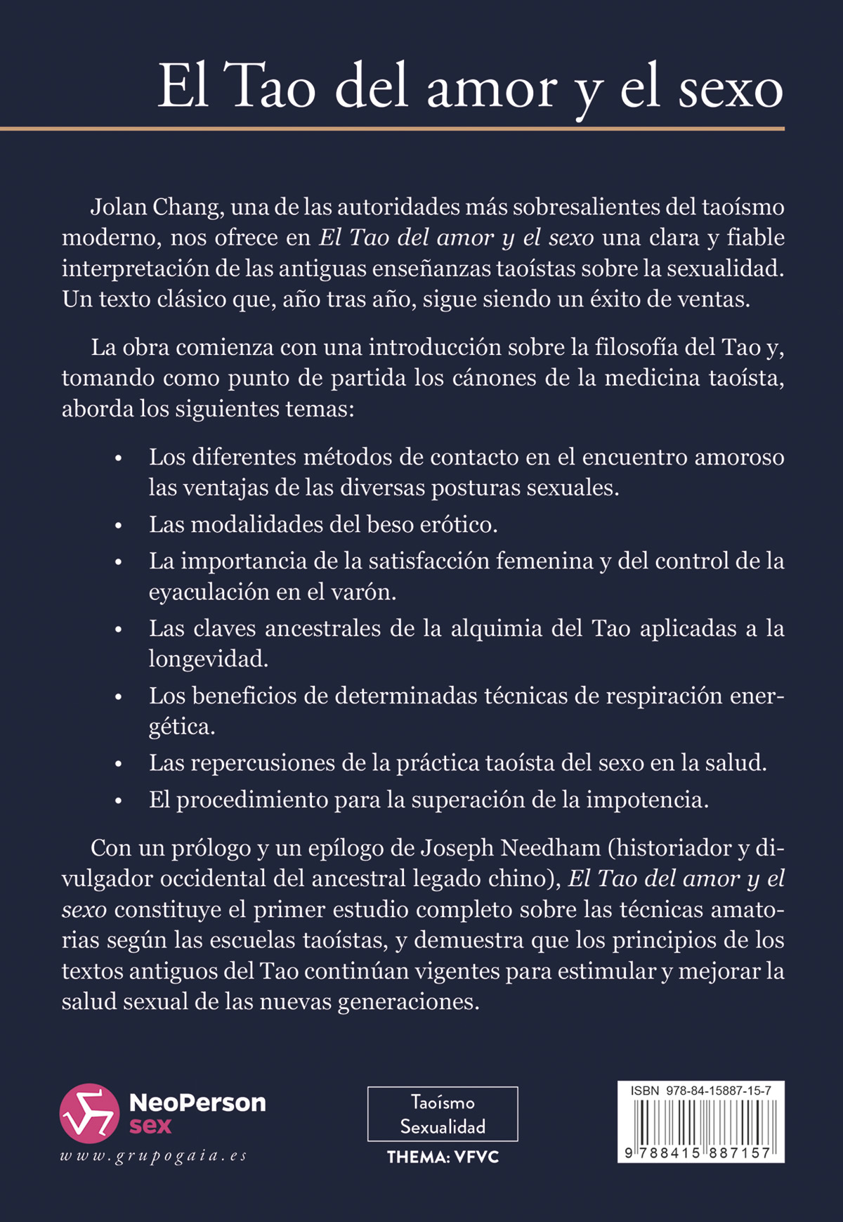 Jolan Chang, una de las autoridades más sobresalientes del taoísmo moderno, nos ofrece en El Tao del amor y el sexo una clara y fiable interpretación de las antiguas enseñanzas taoístas sobre la sexualidad. Un texto clásico que, año tras año, sigue siendo un éxito de ventas.