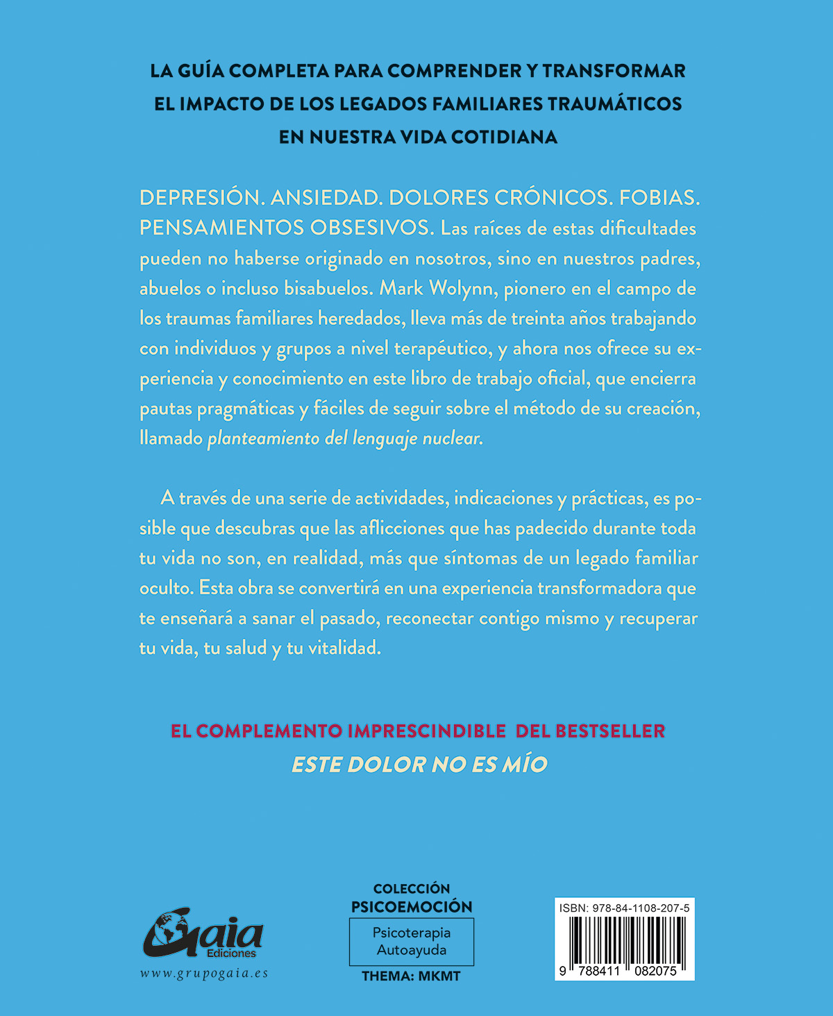 DEPRESIÓN. ANSIEDAD. DOLORES CRÓNICOS. FOBIAS. PENSAMIENTOS OBSESIVOS. Las raíces de estas dificultades pueden no haberse originado en nosotros, sino en nuestros padres, abuelos o incluso bisabuelos. Mark Wolynn, pionero en el campo de los traumas familiares heredados, lleva más de treinta años trabajando con individuos y grupos a nivel terapéutico, y ahora nos ofrece su experiencia y conocimiento en este libro de trabajo oficial, que encierra pautas pragmáticas y fáciles de seguir sobre el método de su creación, llamado planteamiento del lenguaje nuclear.