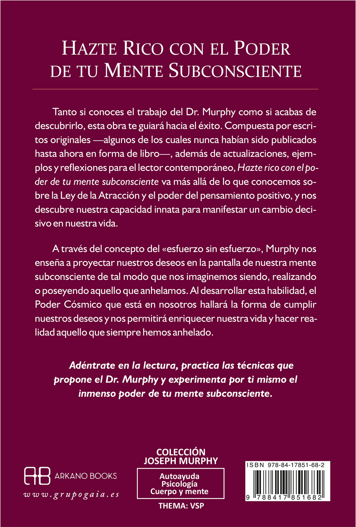 Tanto si conoces el trabajo del Dr. Murphy como si acabas de descubrirlo, esta obra te guiará hacia el éxito. Compuesta por escritos originales —algunos de los cuales nunca habían sido publicados hasta ahora en forma de libro—, además de actualizaciones, ejemplos y reflexiones para el lector contemporáneo, Hazte rico con el poder de tu mente subconsciente va más allá de lo que conocemos sobre la Ley de la Atracción y el poder del pensamiento positivo, y nos descubre nuestra capacidad innata para manifestar un cambio decisivo en nuestra vida.