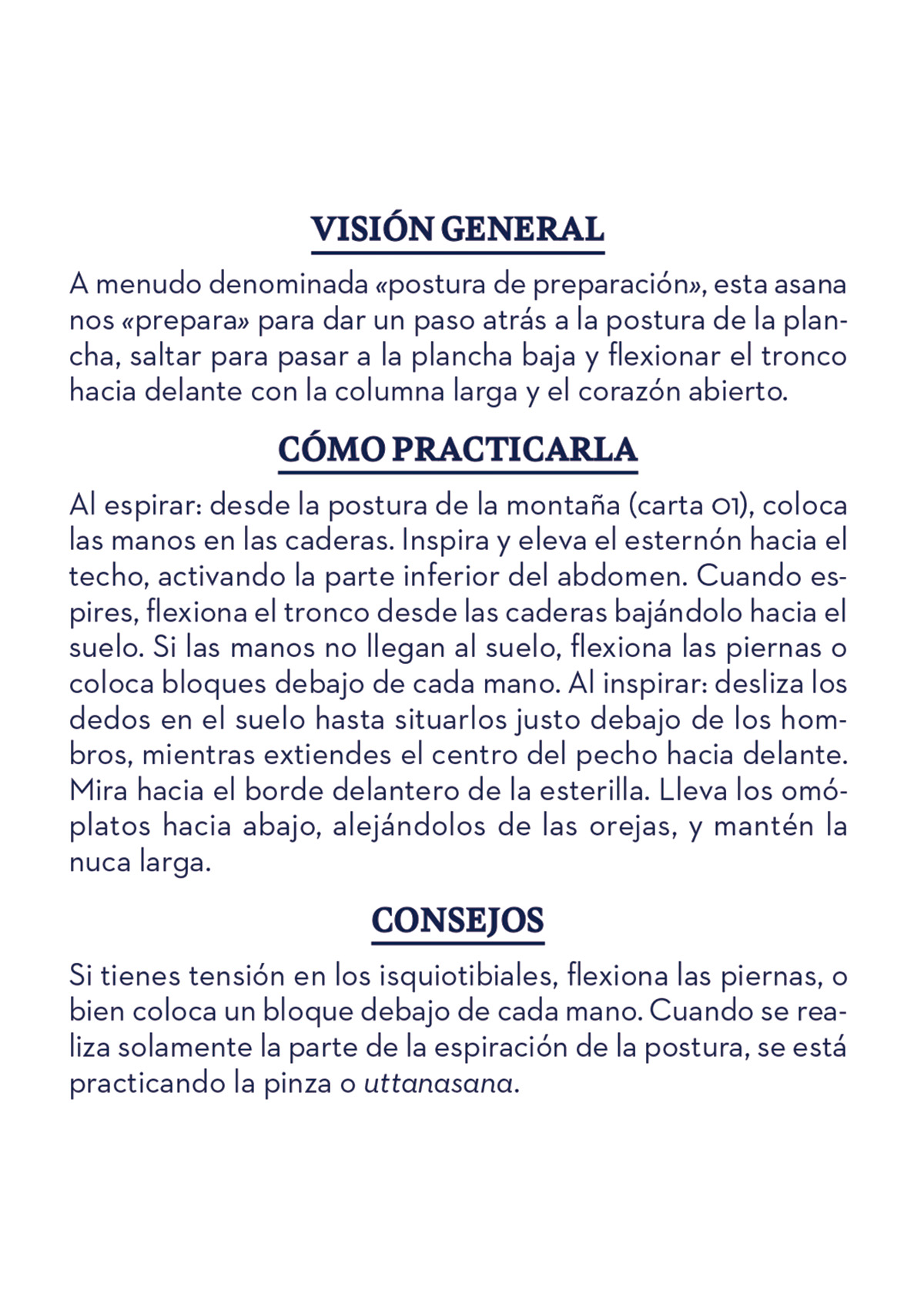 Esta baraja de yoga, creada por el Dr. Deepak Chopra y Sarah Platt-Finger, especializada en la enseñanza de esta disciplina, ofrece mucho más que beneficios físicos. El yoga es una práctica poderosa que une el cuerpo, la mente y el espíritu. Elige una sola carta en la que concentrarte, sigue una secuencia específica de asanas según tus necesidades en cada momento o crea tu propia práctica con esta sencilla baraja. No hace falta que te apuntes a una clase. Solo tienes que coger tu esterilla y encontrar un espacio en el que te sientas a gusto para empezar.