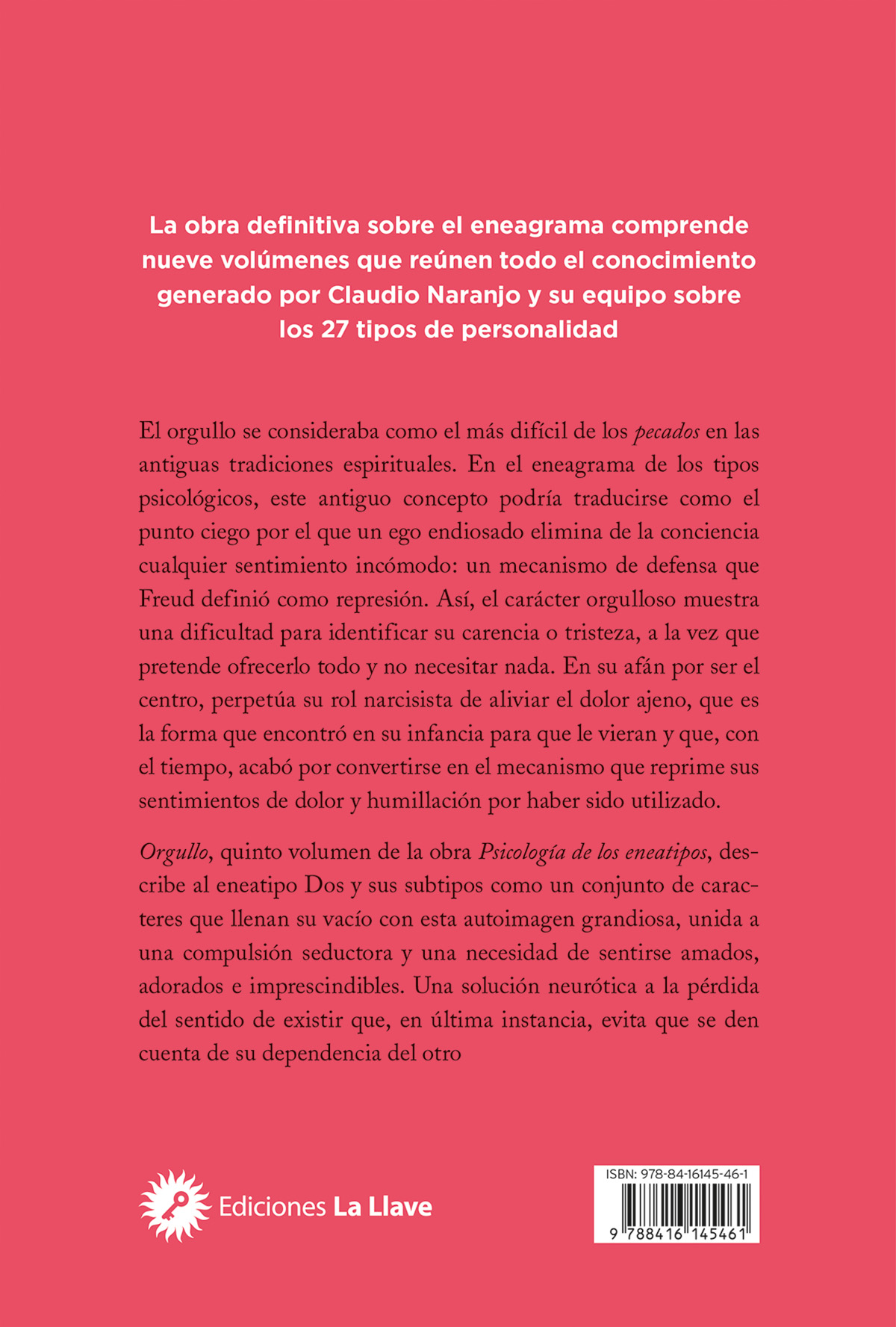Quinto volumen de la colección Psicología de los Eneatipos, donde un amplio equipo de colaboradores, dirigido por el Dr. Claudio Naranjo, desarrolla nueve tomos, dedicados a cada uno de los eneatipos o caracteres descritos en este sistema de estudio de la personalidad. Cada día más, el eneagrama es conocido por ser el sistema de análisis de la personalidad más popular. Esta colección está destinada a convertirse en la obra de absoluta referencia sobre la materia, con un esfuerzo de investigación y de recolección de testimonios y evidencias como nunca antes se había realizado. Cada uno de los nueve libros que componen esta obra presenta una extensa descripción de cada eneatipo: subtipos Conservación, Sexual y Social, equivalencias académicas, rasgos más destacados, biografías, personajes célebres, problemas en el amor, así como un amplio conjunto de recomendaciones terapéuticas. ‘Orgullo. Caprichosos, histriónicos y conquistadores’ describe al eneatipo 2 y sus subtipos como un conjunto de caracteres que llenan el vacío con una imagen grandiosa de sí mismos, unida a una compulsión seductora y una necesidad de ser amados, adorados y necesitados sin tener conciencia de su dependencia del otro.