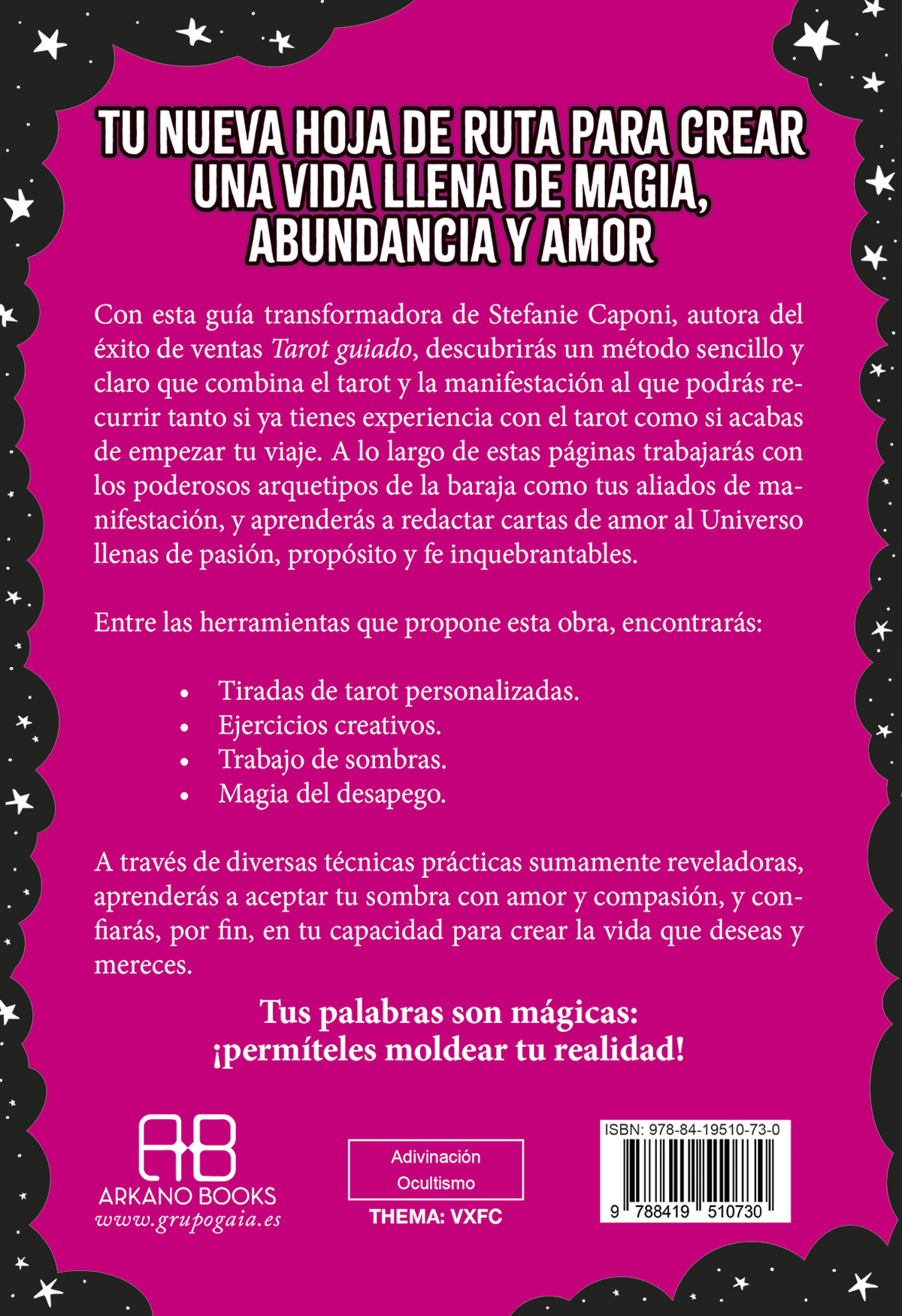 Con esta guía transformadora de Stefanie Caponi, autora del éxito de ventas Tarot guiado, descubrirás un método sencillo y claro que combina el tarot y la manifestación al que podrás recurrir tanto si ya tienes experiencia con el tarot como si acabas de empezar tu viaje. A lo largo de estas páginas trabajarás con los poderosos arquetipos de la baraja como tus aliados de manifestación, y aprenderás a redactar cartas de amor al Universo llenas de pasión, propósito y fe inquebrantables.