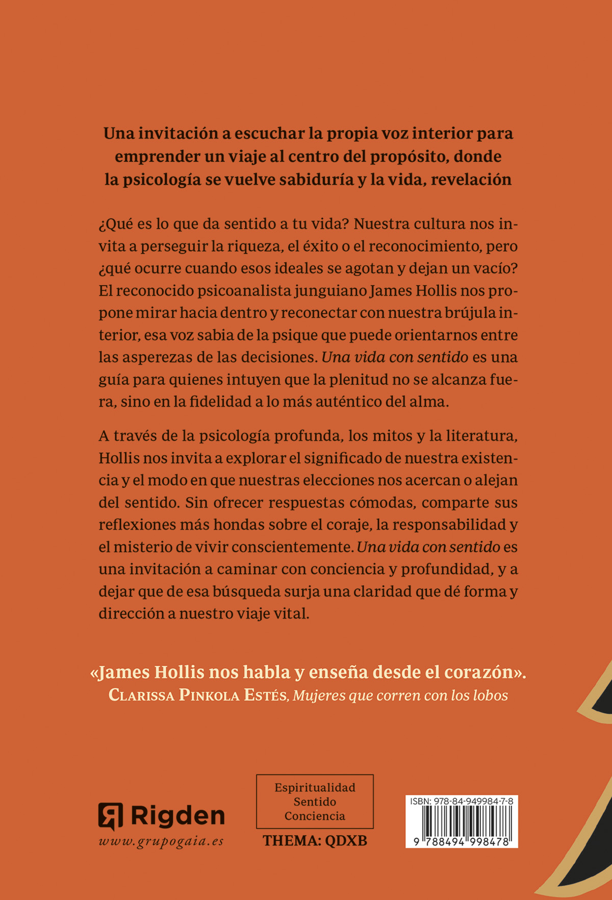 A través de la psicología profunda, los mitos y la literatura, Hollis nos invita a explorar el significado de nuestra existencia y el modo en que nuestras elecciones nos acercan o alejan del sentido. Sin ofrecer respuestas cómodas, comparte sus reflexiones más hondas sobre el coraje, la responsabilidad y el misterio de vivir conscientemente. Una vida con sentido es una invitación a caminar con conciencia y profundidad, y a dejar que de esa búsqueda surja una claridad que dé forma y dirección a nuestro viaje vital.