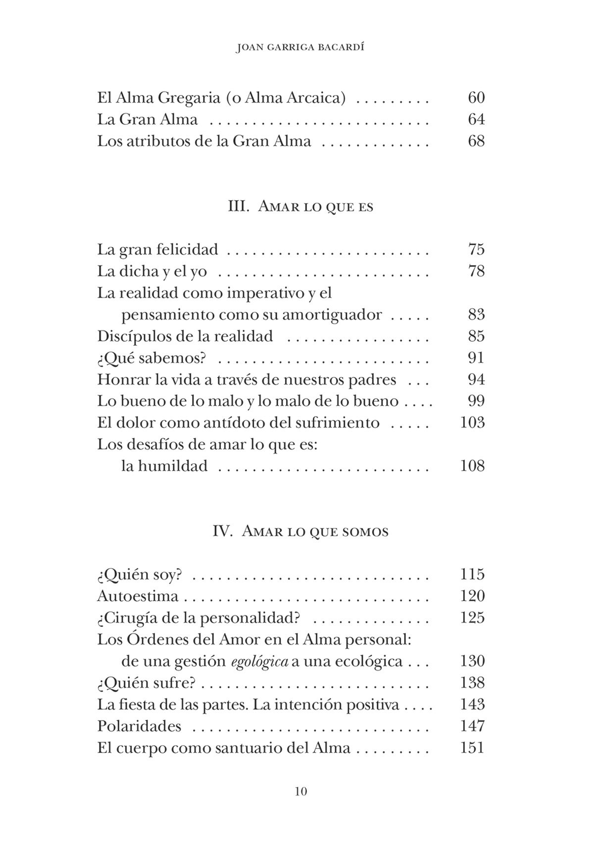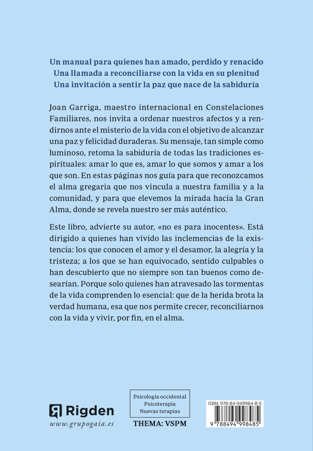 Joan Garriga, maestro internacional en Constelaciones Familiares, nos invita a ordenar nuestros afectos y a rendirnos ante el misterio de la vida con el objetivo de alcanzar una paz y felicidad duraderas. Su mensaje, tan simple como luminoso, retoma la sabiduría de todas las tradiciones espirituales: amar lo que es, amar lo que somos y amar a los que son. En estas páginas nos guía para que reconozcamos el alma gregaria que nos vincula a nuestra familia y a la comunidad, y para que elevemos la mirada hacia la Gran Alma, donde se revela nuestro ser más auténtico.